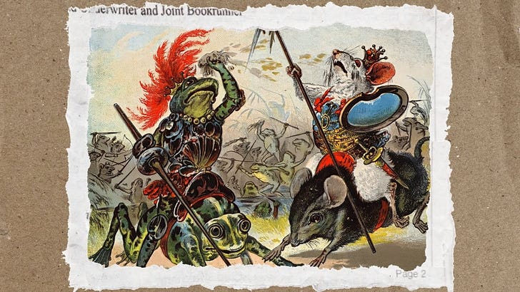 La palabra batracomiomaquia significa, literalmente ‘batalla de las ranas y los ratones’.