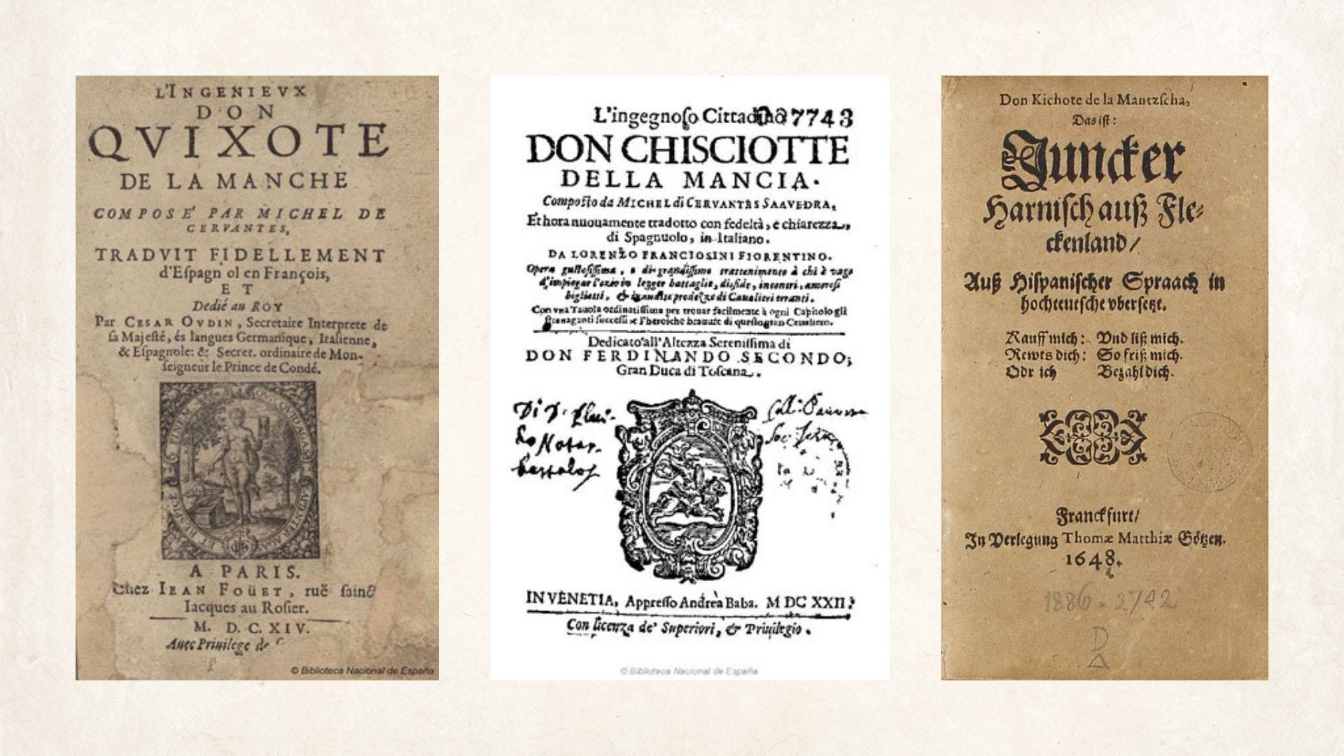 Uno de los argumentos para la cronología de la velarización en general es justamente la grafía del título en las traducciones del Quijote. Nos vamos a centrar en tres: la del francés y la del italiano por una parte y la del alemán por otra.